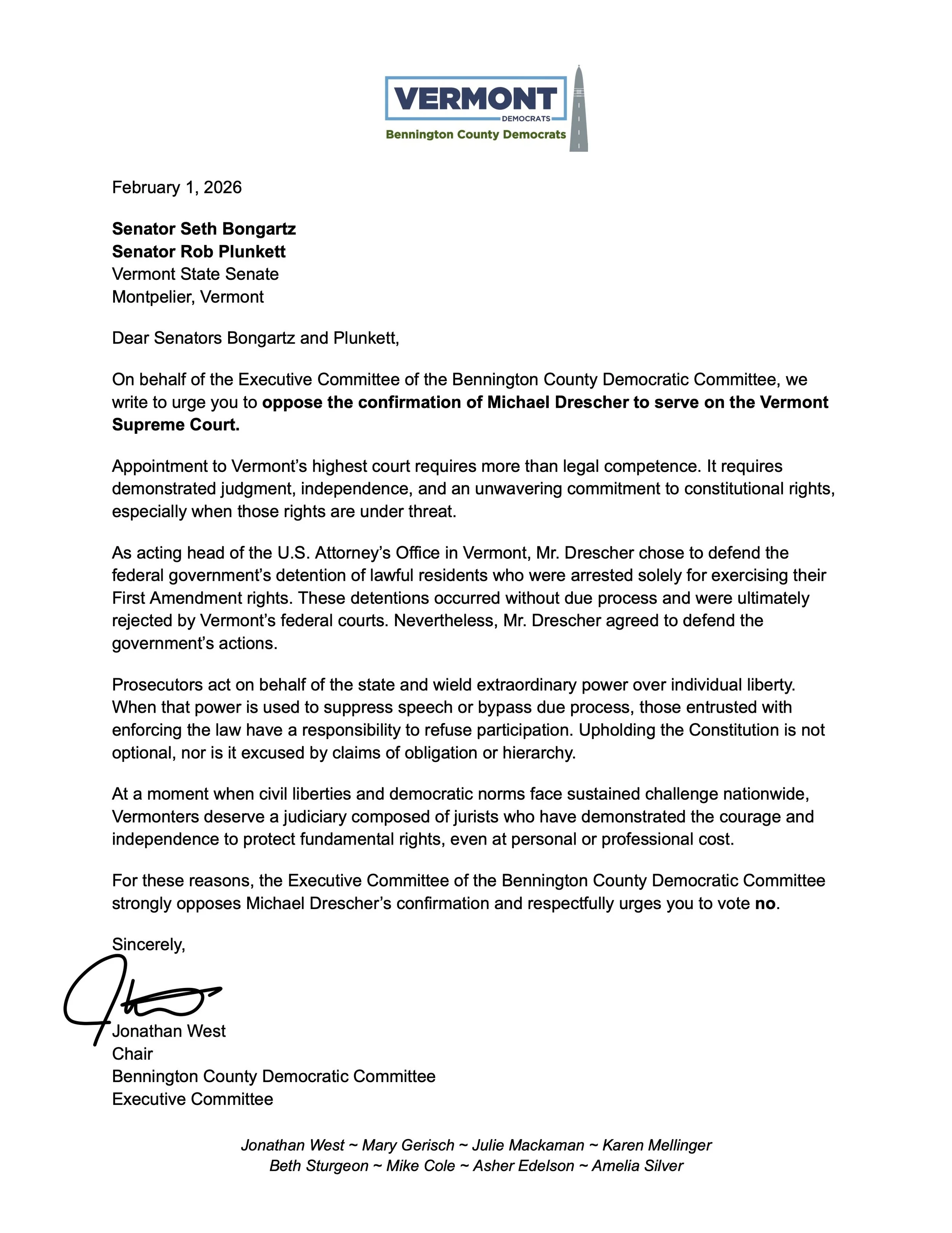Bennington County Democratic Committee Urges Opposition to Drescher Supreme Court Nomination